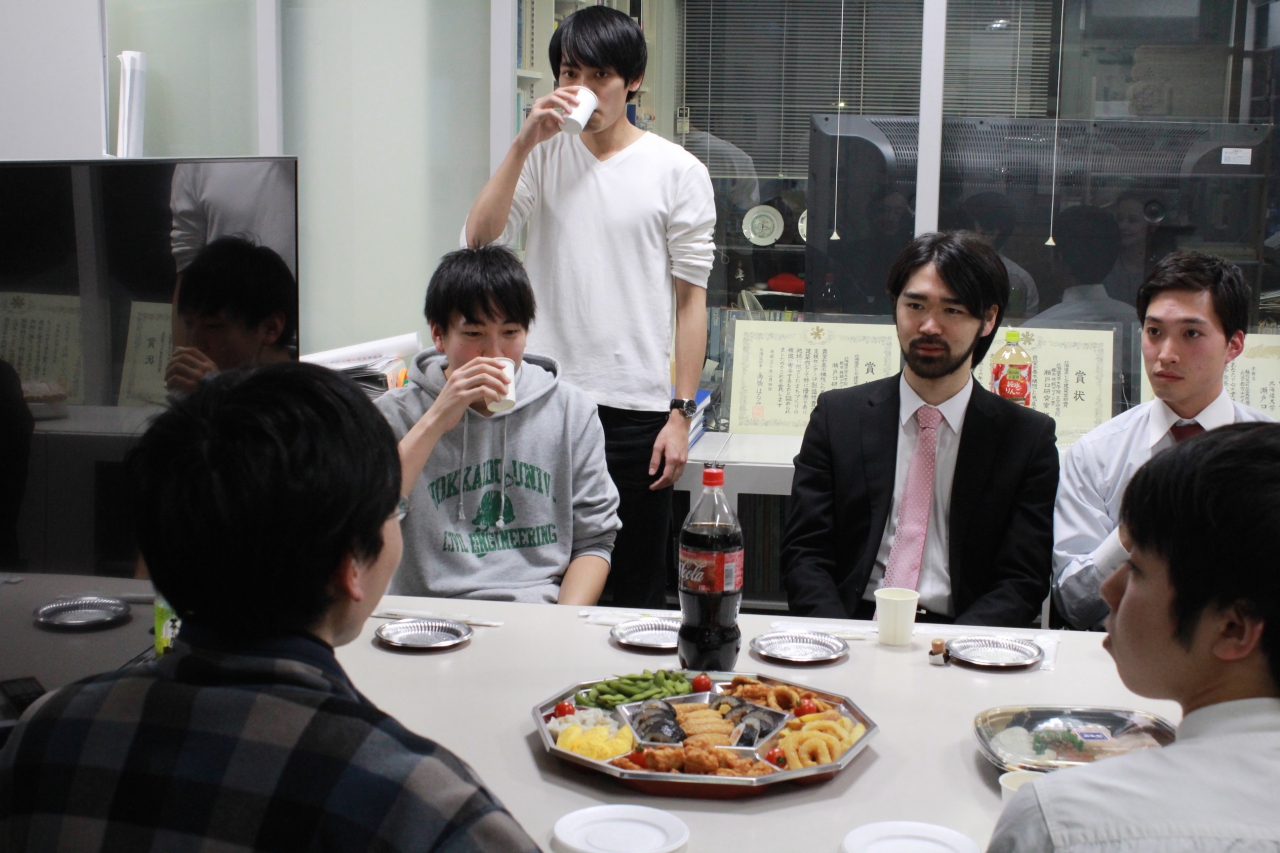 この日は、修論発表を終えた修士2年生のお疲れ様会と、1月生まれの久保山さんと松田のお誕生会も併せて行いました。