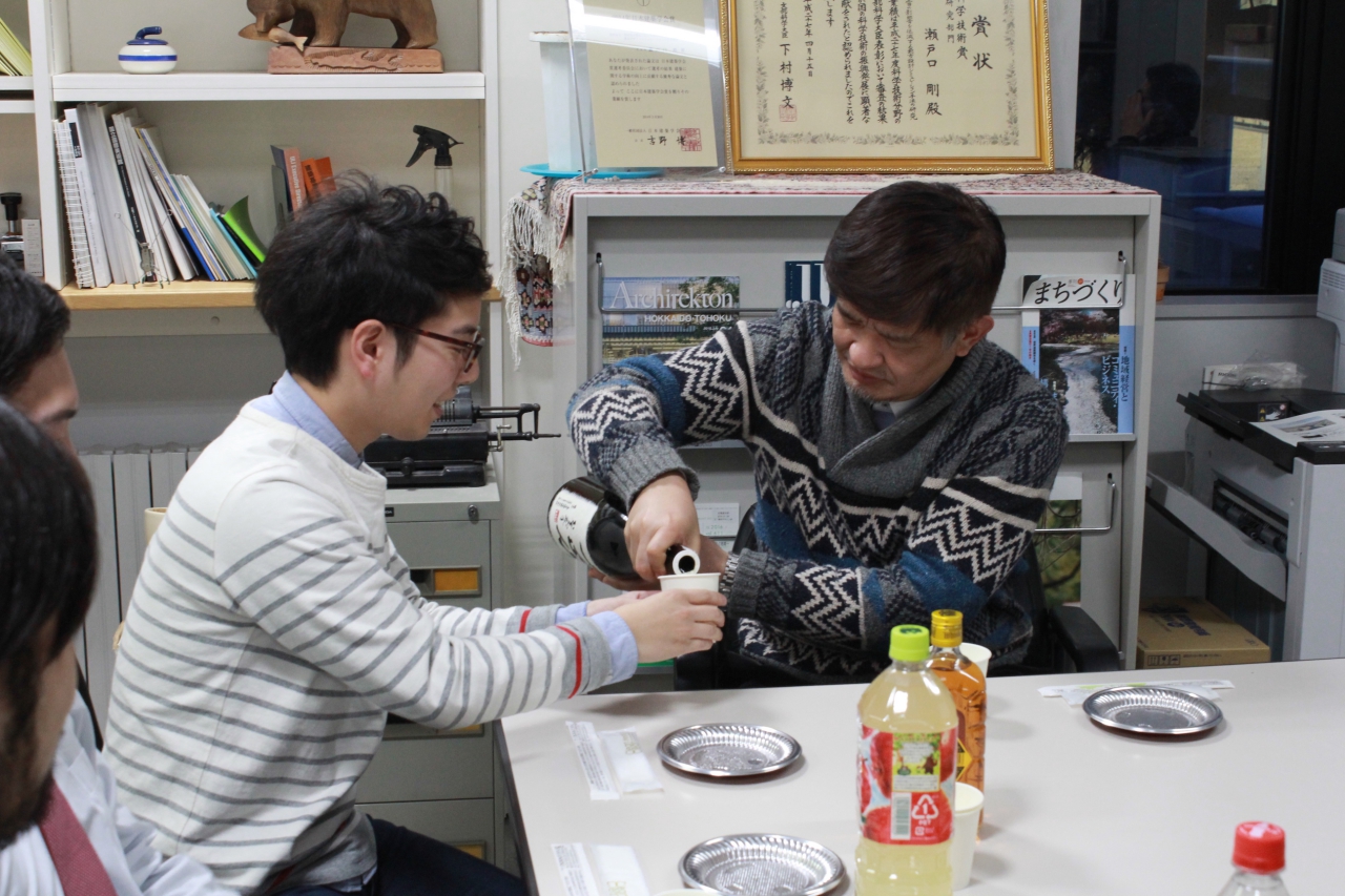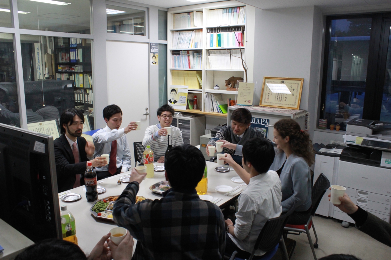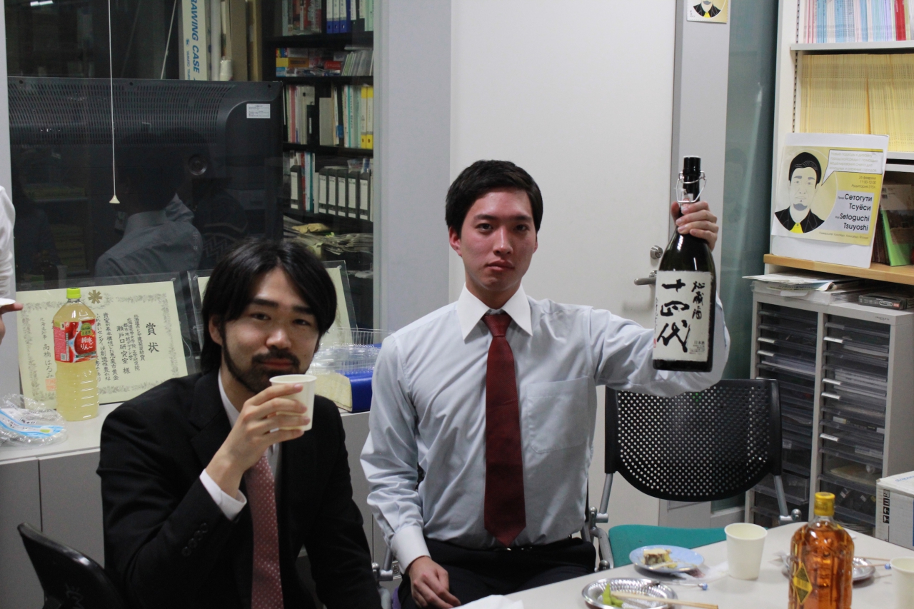 この日は、修論発表を終えた修士2年生のお疲れ様会と、1月生まれの久保山さんと松田のお誕生会も併せて行いました。