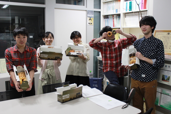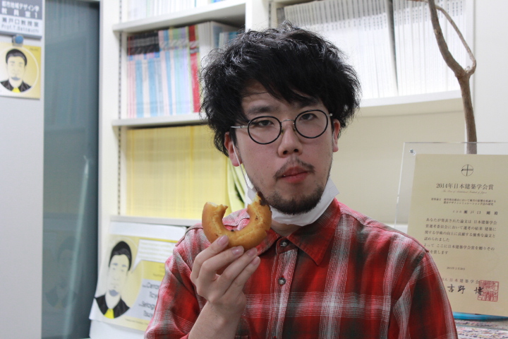 ドーナツを食べて、ご満悦の学士4年 樫村君