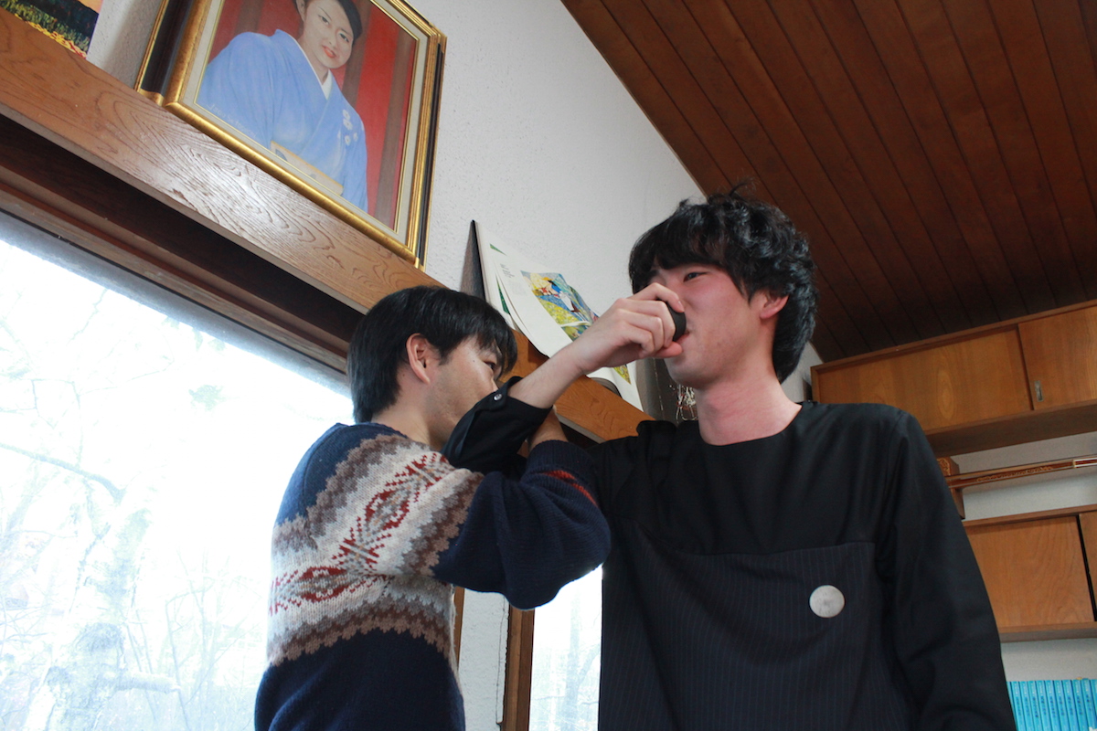 (これは友情の証だそうですが、、、。(左、修士2年松山 右、学部4年横山))