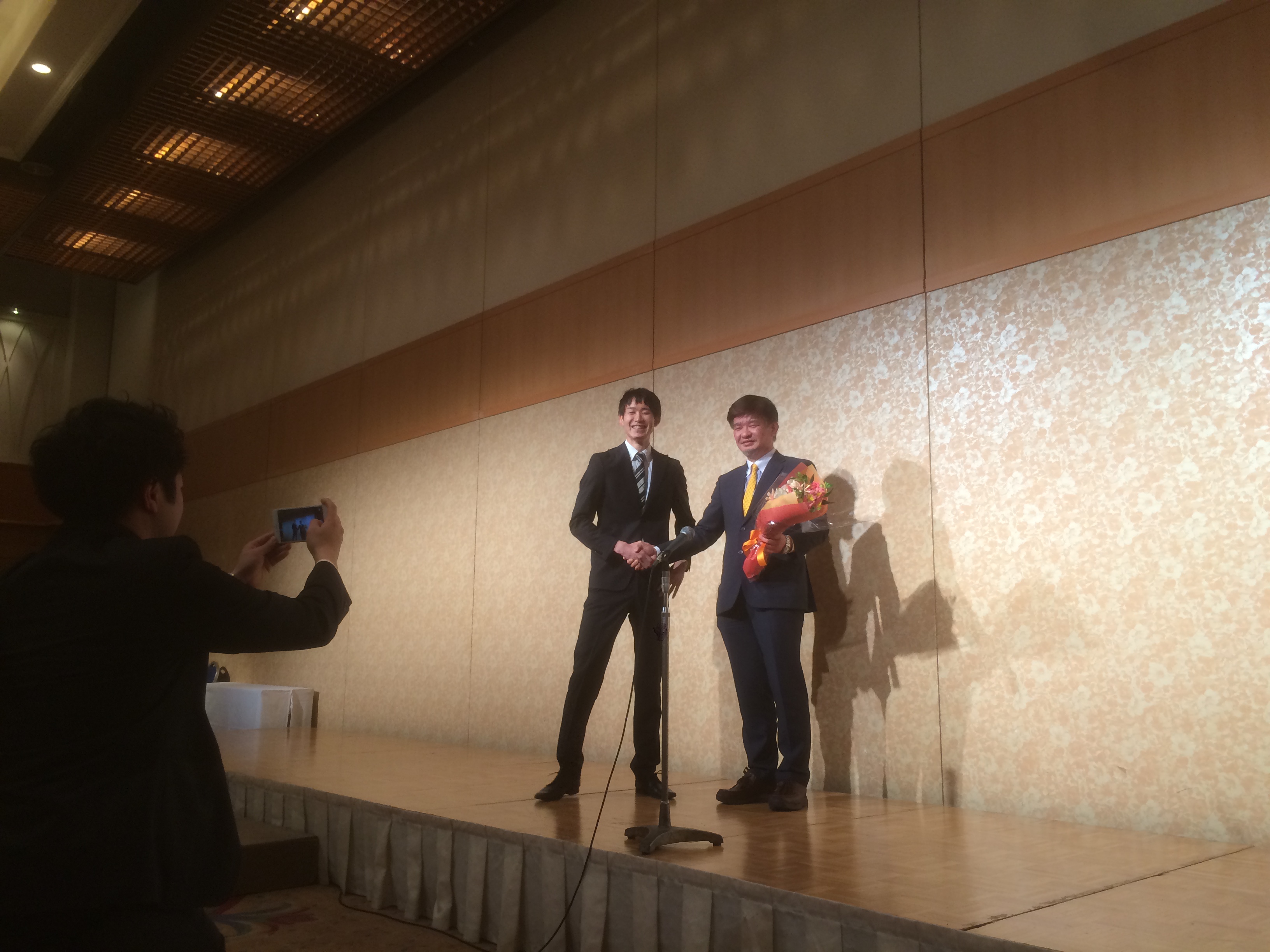 瀬戸口先生も2014年度日本建築学会賞及び日本都市計画学会計画設計賞を受賞されたので、前田さんから花束が贈呈されました。